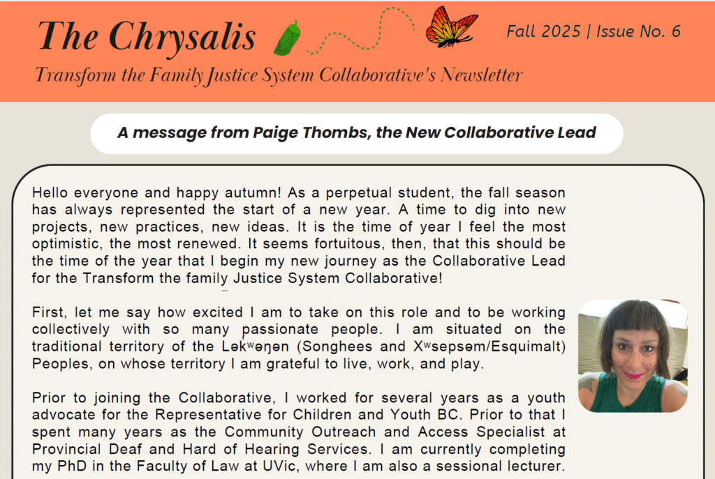 Fall 2025 Issue of the Chrysalis Posted on October 31, 2025 by Tina Parbha The sixth issue of the Transform the Family Justice System Collaborative’s Newsletter is now available. Click the image below to view it.