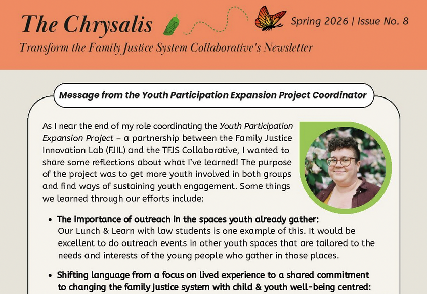 The Chrysalis is our quarterly newsletter providing updates about the Collaborative and its Communities of Action (CoA’s). System change is all about people and building relationships, so each issue also showcases one of our participants and describes our upcoming events. Please subscribe and keep in touch!